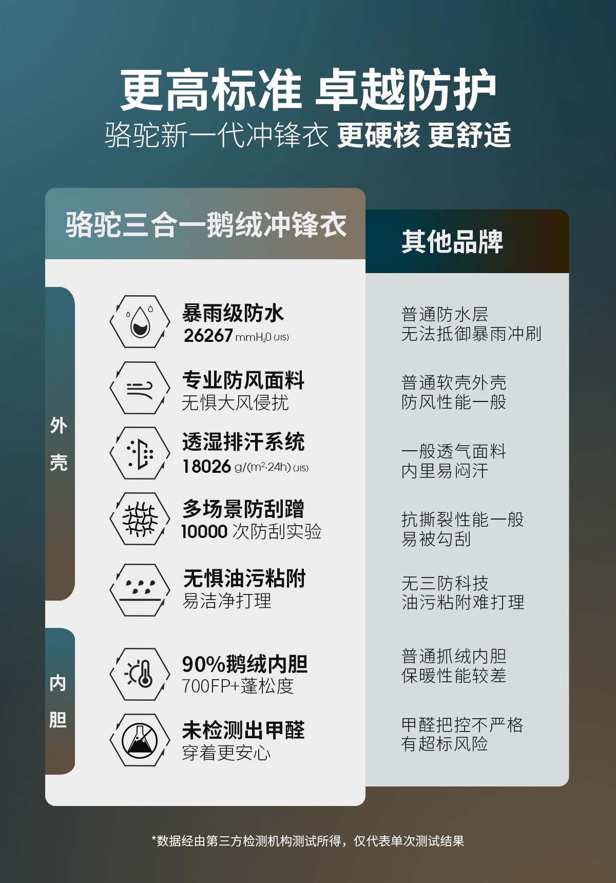 商品名称:骆驼冲锋衣三合一羽绒服王者凯甲ICON男女新款防风防水鹅绒版外套